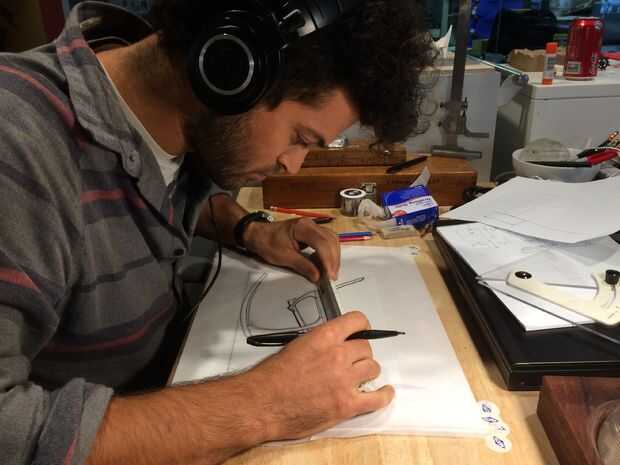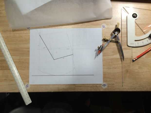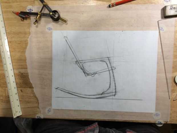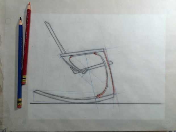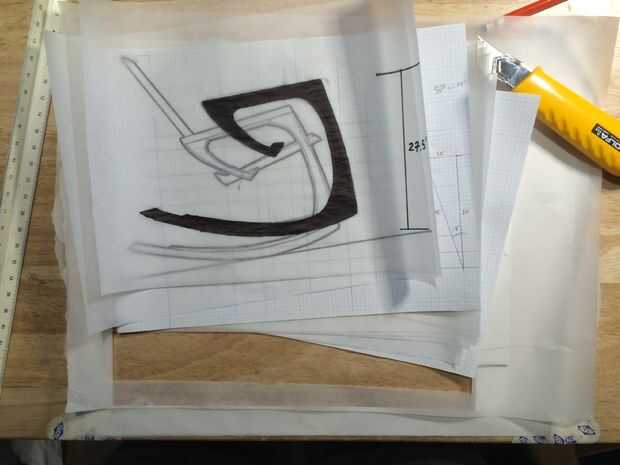 En primer lugar, presenta la geometría subyacente de alturas y ángulos. Entonces bosquejó algunas formas ásperas sobre la parte superior de este, dimensiones bruto agregado de madera que puedan crear las piezas y continua para perfeccionar las formas a partir de ahí. En este punto, yo estaba pensando usar aluminio en el exterior de la de la madera - una idea que cambiaría con el tiempo.