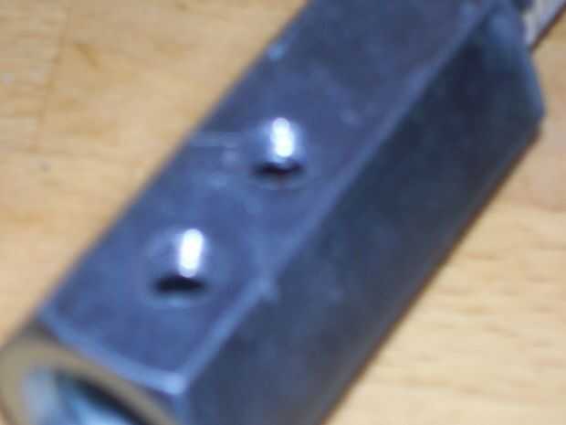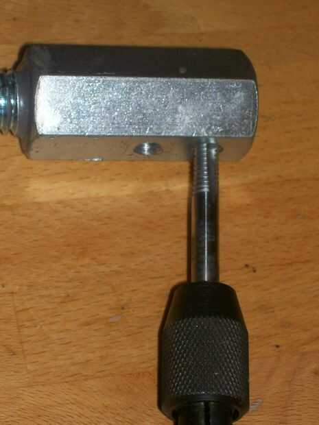 Después de perforar dos agujeros, asegurándose de aburrir agujeros perpendiculares a la tuerca, utilice una llave de 1/4 "x 20 para roscar los agujeros para los tornillos, asegúrese de añadir aceite a los agujeros mientras gira el grifo firmemente en los orificios.