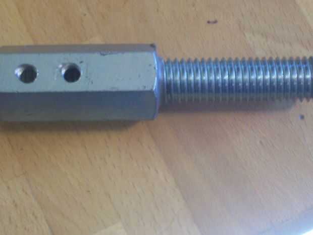 Taladre los agujeros con el taladro, sostener la tuerca firmemente con las abrazaderas de tornillo en el extremo opuesto de la tuerca del conector como la varilla roscada se coloca para que las aberturas son en donde se sentará el eje del motor.