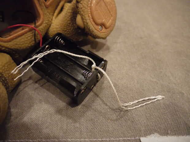 En el lado opuesto de los cables se encuentra dos agujeros. Taladrar un agujero tercera de un lado del titular a la otra permite pones un bucle de cadena pequeña en que puede utilizar para sacar el soporte de Pleo. ATA una cuerda. Terminé el ciclo de la soldadura con una cuchara calentada sobre una llama de alcohol, pero si eres bueno con nudos no necesita hacer eso.