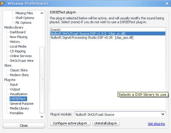 Esto abrirá el menú prefrences. A la izquierda, desplazamiento abajo y debajo de plugins haga clic en DSP/Effect. Haga doble clic en Nullsoft SHOUTcast Source DSP.
