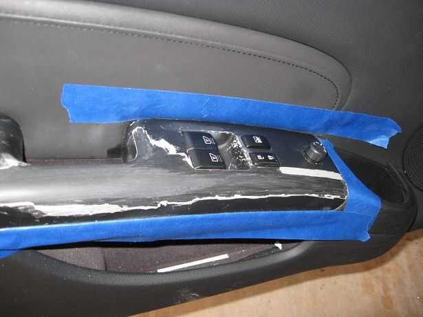 comencé a grabar el área apagado antes de acabado raspado, para ayudar a proteger las zonas sin pintar y que me ayude a ver mis bordes. Finalmente raspa todo excepto el área hacia la perilla de ajuste del espejo. ¿Ver la franja gris a la derecha? Dejé eso, y la pintura por encima de esa línea es el acabado original. También, había dejado. Noté que después de un par de horas, perdí la paciencia con el raspado. Pensé, es mi coche. No parece mucho peor que cuando empecé. Lija en toda la zona raspada.