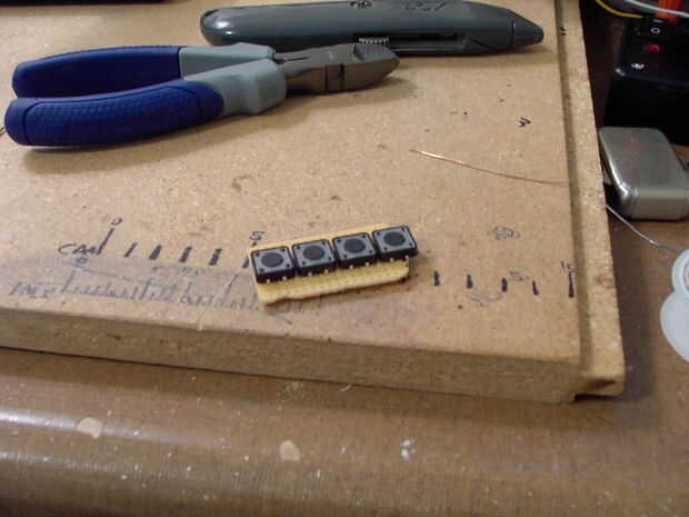 Necesitamos conectar 1 lado de cada interruptor a tierra. Para ello he "había cosido" y coloca un alambre de cobre a la extraña numerados pernos en el lado izquierdo del tablero. Luego soldar todos los pines de ese lado.