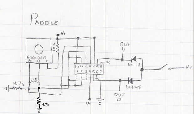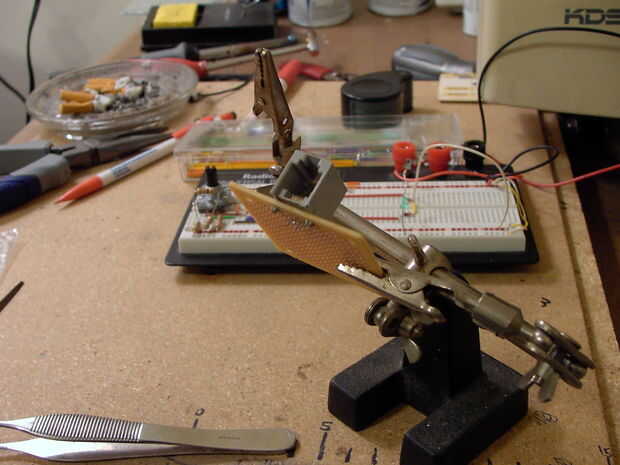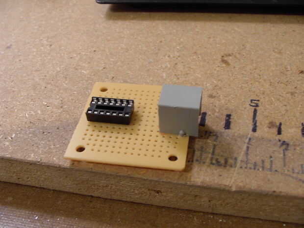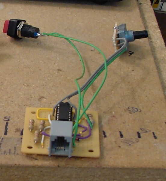 construcción es bastante estándar, poner tus cosas más grandes en primer lugar para que sala y conectar todo de nuevo, el codificador se conecta mediante un cable de cinta de 3 conductores y una franja de perfboard (para hacer más fácil y, por lo que después nos podemos perno a la cara de la caja) y el interruptor de pulsador de incendio está conectado con unas piezas sueltas