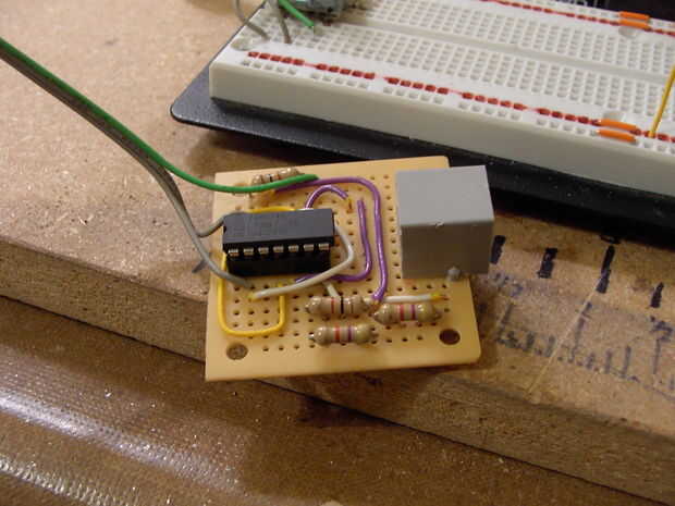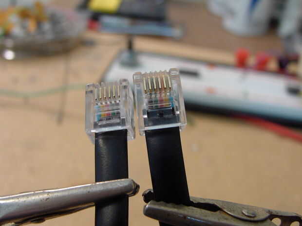 He comprado un 7 pies de largo 6 (sólo necesitamos 4) cable de teléfono del conductor en mi local k-mart y todo soldado juntos, cuando conecta el circuito (sin el 74HC74 enchufado en una toma) y revisar mis voltajes todo estaba al revés! Eso es cuando noté que el cable del teléfono está conectado al revés en un extremo