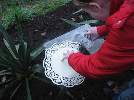 los tapetitos de la torta que se diviertan los patrones así que agarró una servilleta de pastel y colocado sobre el viejo taburete, rocía sobre el tapete de la torta
