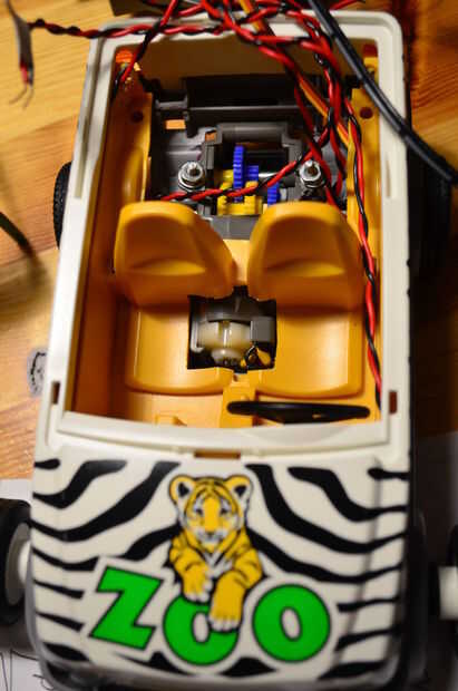 Tuve que modificar el habitáculo amarillo en algunos aspectos. Tuve que cortar un agujero en el asiento, para dejar espacio para el motor, de lo contrario no se deslice hacia abajo en lugar. También quité toda la "camioneta" (el Zoomobil es básicamente una camioneta pequeña) para hacer espacio por encima de la caja de engranajes y debajo de la placa de circuito.