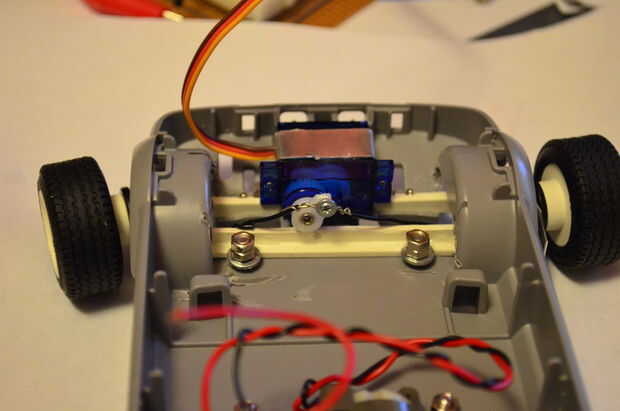Aseguró el servo al chasis mediante una banda de metal atornillado hasta el plástico. Otra vez, me llamó la atención el hecho de que el diseño del carro incluido suficiente espacio debajo de la "campana" que permitió esta sin modificaciones externas.