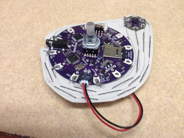 Para nuestro sistema, se utilizó cartulina y había cosido nuestro reproductor de LilyPad MP3 y acelerómetro directamente sobre él. Entonces, creamos un bolsillo en el interior de la camisa para la cartulina que se insertará. Utilizamos a tela de extraña para hacer el bolsillo y el hilo regular, no conductor para enlazar el bolsillo de la camisa. Nos cortan rajas en la mierda para el codificador, los dientes para el programador y la toma de auriculares ser expuesto.