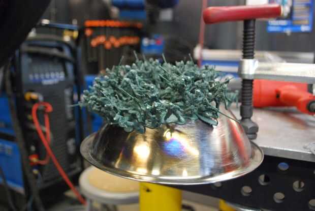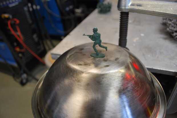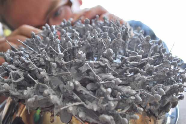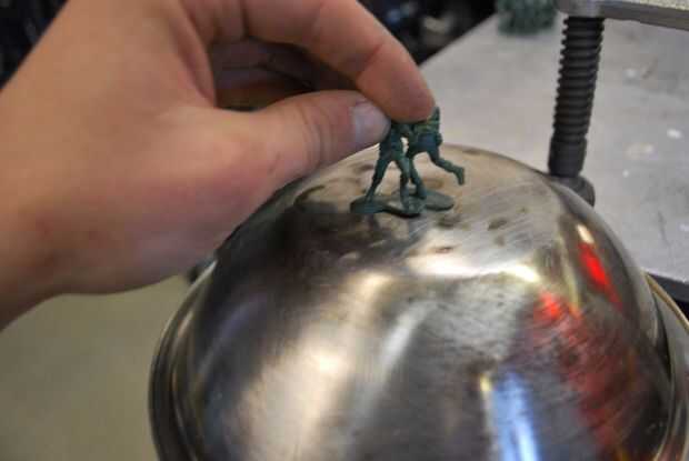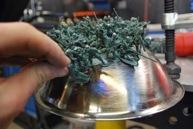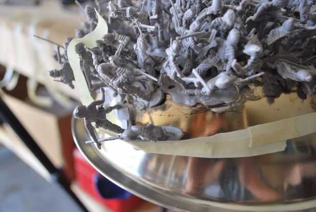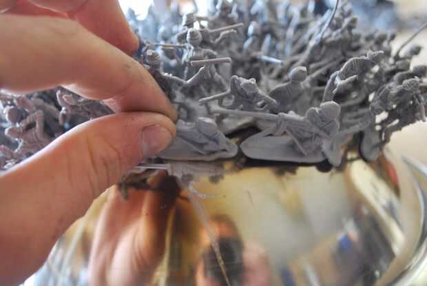Empezar colocando unos hombres un tiempo ta en la parte superior de la taza y luego mover hacia afuera. Me pareció útil usar alguna cinta adhesiva para sujetar a los hombres como sus pies derretido. Una vez esté satisfecho con la cantidad de hombres en la taza, usted puede levantar el pelotón entero, a la vez.