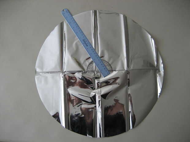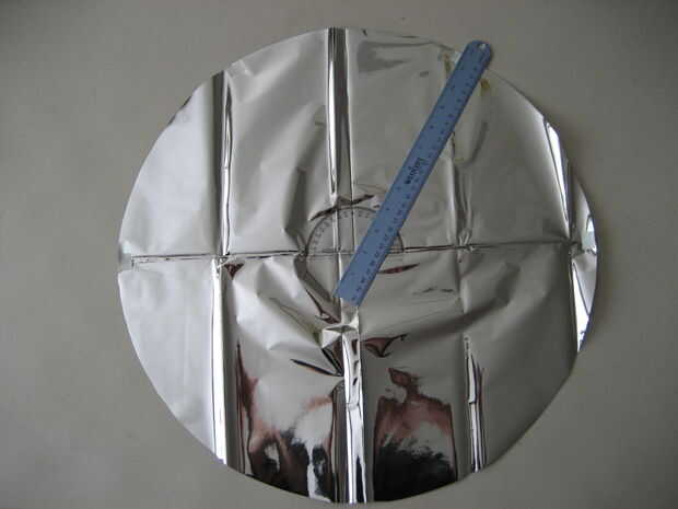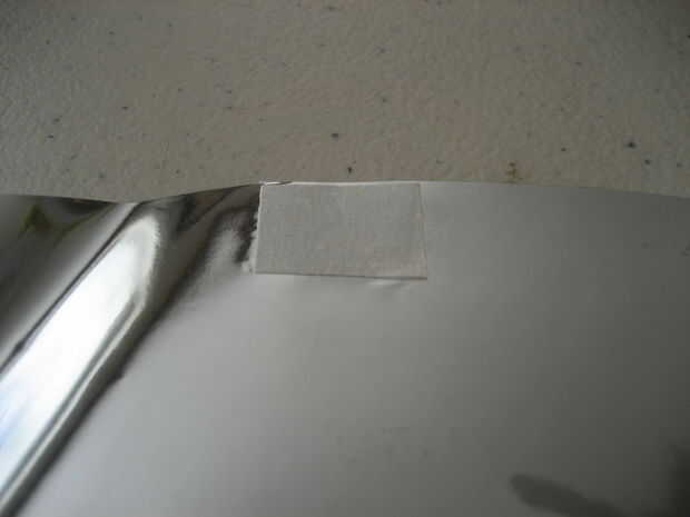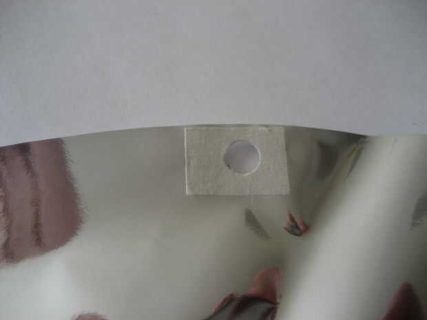 Preparar 12 pedazos de cinta adhesiva cortan a 1/2" de largo.  Dos de estos en el borde del círculo coloque sobre uno de los pliegues que se ejecuta el diámetro del círculo.  Coloque el transportador en el centro del círculo de mylar, de manera que se alinea con la línea del mismo diámetro.  Coloque una regla en la marca de 60 grados en el transportador y coloque un pedazo de cinta en el borde del círculo de mylar.  Coloque la regla en la marca de 120 grados y coloque otro pedazo de cinta.  Repita para la parte inferior la mitad del círculo.  Cuando termine, debe ser 6 piezas de cinta espaciados a 60 grados alrededor del círculo de mylar.  Girar el círculo y coloque el último 6 de cinta en los mismos lugares que los de la primera cara de la pieza.  Use una perforadora para hacer agujeros en el centro de las piezas de la cinta.