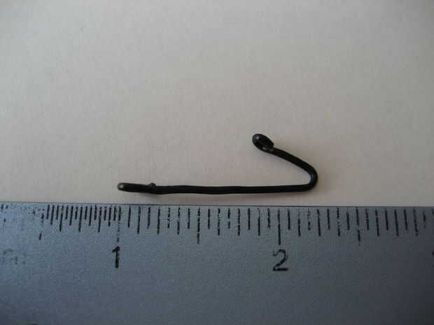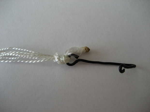 Doblar un clip de papel para hacer un gancho de hombre del ejército.  Ver las fotos para obtener un ejemplo del gancho que utiliza para este instructable.  Coloque el paracaídas en el anzuelo con un nudo de ocho o un nudo y pegamento CA.