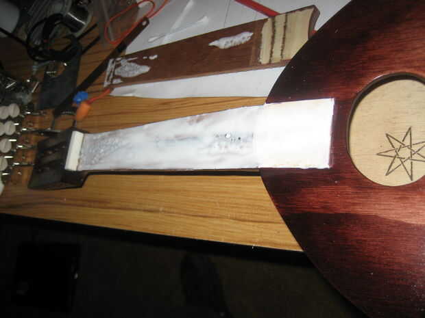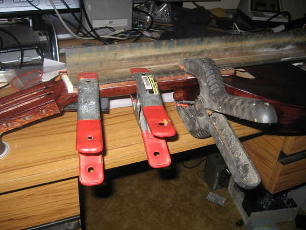 Para la tuerca he utilizado un blanco hueso blanco de Stewmac. Cortar a la anchura del cuello y había acortada a aproximadamente 1/8" de orgullosos del diapasón y había pegado en el mismo tiempo que el diapasón. Para asegurar la presión de sujeción incluso en los trastes usé un trozo de hierro de ángulo en la parte superior. Comprobar que todo está donde debe estar y no dejes que cualquier pegamento funciona seco en su bonito acabado de cuello nuevo.