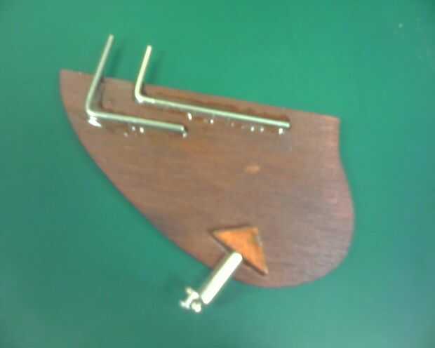 Si usted quiere un resto del dedo, cortar una del capas utilizando el patrón del resto de dedos. Os adjunto mina con un par barras rescatado de una unidad de CD de PC muerta, pero nada ~1/8 "funcionará. Había doblado de las varillas en ángulo recto, enrutan canales para que puedan sentarse en la parte posterior del resto de dedos y ajustaron en su lugar. Para sujetar el instrumento, las localidades de barra de transferencia al borde de la extensión del diapasón/diapasón y perforaciones de tamaño adecuado. También necesitarás un pequeño bloque de madera pegado a la espalda, y algo para acoplarlo al borde de la llanta con la moda. Todo lo que necesitaba en mi papelera de tornillo encontré.