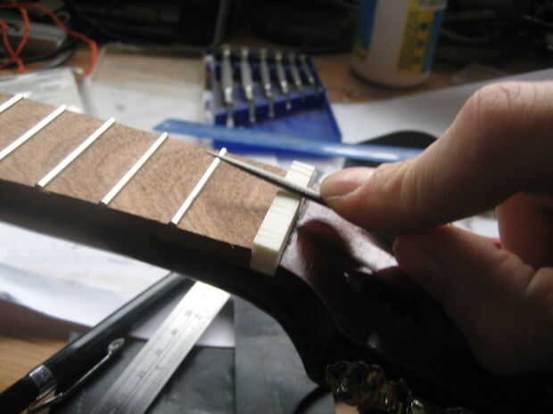 Cuando todo está todo seco puede poner sus clavijeros en si no lo has hecho ya, archivo algunas muescas de cadena y cadena. Transferencia de las marcas del diagrama de espacio de cadena en la tuerca y el puente y poner algunas muescas con una V en forma de archivo de la aguja. Desea que el ángulo de las muescas en la tuerca que entre el diapasón y el clavijero, que estoy tratando de ilustrar en la última foto.