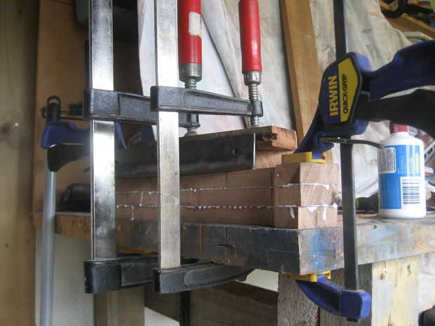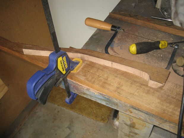 Para la headblock y tailblock tuve laminado juntos algunas piezas de mi suelo de madera a 1 3/4" acción. Una vez que un bloque de 6 "x 3" x 1 3/4" traza la curva de headblock sobre él desde el plan de acción. Puede cortar la ficha de talón del cuello en el plan de acción para esto, que no necesitaremos otra vez.