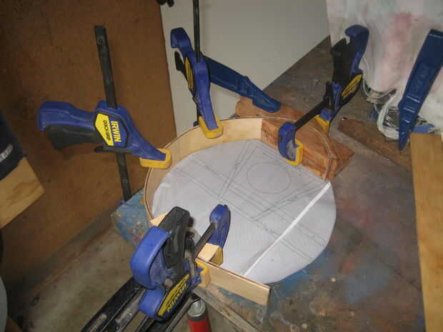 Fije los lados junto a la cabecera con una tira de cinta de enmascarar de 2" en el exterior, luego ponerlo todo en el plano y pegamento en los bloques de cabeza y cola, asegurándose de conseguir pegamento en las uniones de tope entre las 2 tiras.