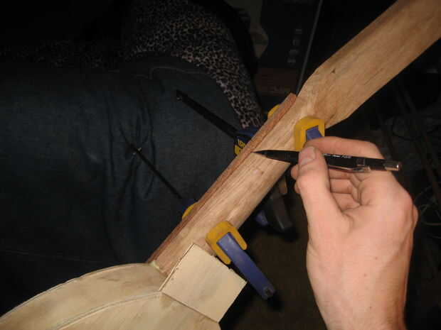 Ahora su tiempo para probarlo ajuste al cuello, recordando a, coloque la tuerca en su lugar por un espaciador. Marque las líneas del cuello en la parte trasera del diapasón y luego lo plano a forma.