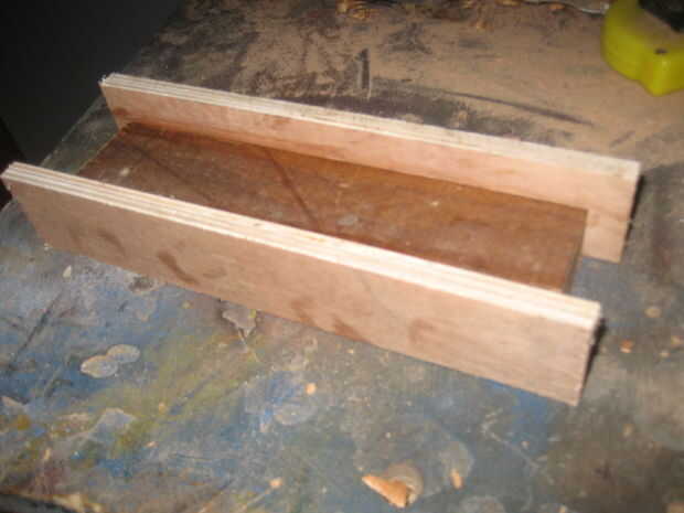 En primer lugar, construir un pequeño jig caja como puedes ver en la primera foto. Para hacer la guía de cortes en ella, poner un trozo de perfectamente cuadrado cortar madera en él y ejecuta tu sierra a lo largo para conseguir los cortes hacia abajo.