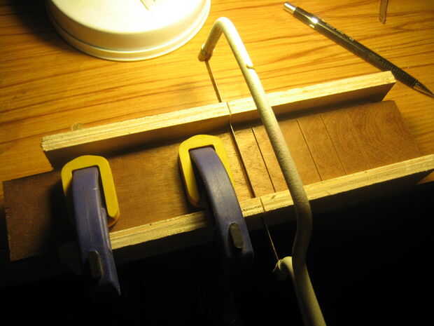 Transferencia de las posiciones del traste a la madera, asegurándose de que usted tiene un extremo cuadrado en la tuerca antes de empezar. Entonces su bastante sencillo, corte una ranura en cada marca, a una profundidad no muy a la mitad el diapasón.