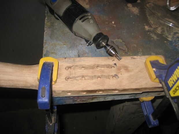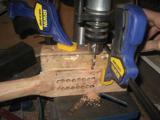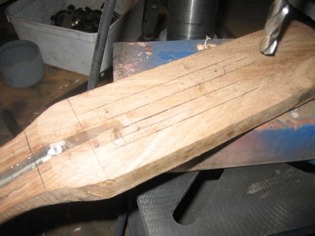 Una vez que tuve las ranuras rugosa hacia fuera, hice los agujeros. A los centros marcados cumplí todos los mandos del sintonizador hasta que los orificios de la cadena fueron paralelos y luego muy cuidadosamente con un lápiz mecánico, marcan los puntos en el borde del cabezal a través de los orificios de la cadena de los sintonizadores. Sujeta una broca de madera de una cerca para el taladro para asegurarse de que los agujeros que aburrido verdad.