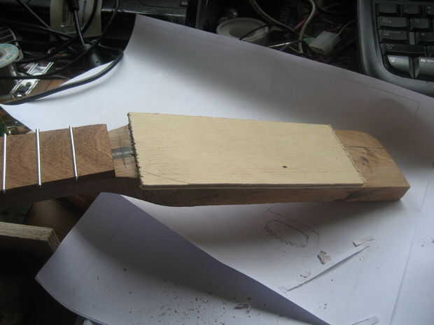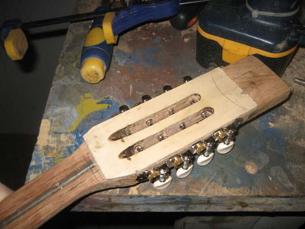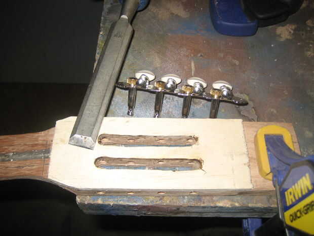 Mi proceso para conseguir las ranuras fue algo así como: taladro, dremel con broca, el cincel, el archivo. Su práctica generalmente estándar de chapa de la cara o la cara y la parte trasera del clavijero con madera dura. No tengo, pero necesitaba un poco extra grueso para mi clavijeros. Y cubre hasta el extremo de la barra del braguero que se hubiera divertido un poco lo contrario.