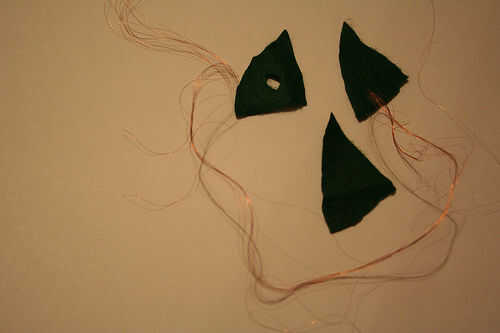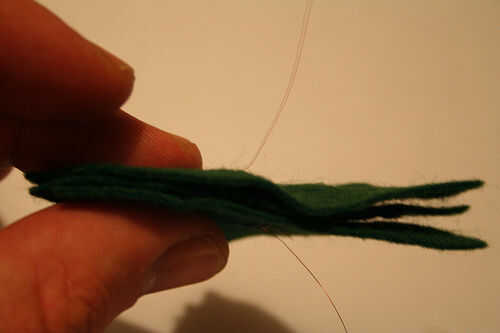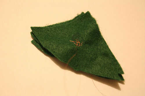 • Con la pistola de pegamento caliente, pegar los tres pedazos de fieltro junto, con las dos piezas de fieltro con el alambre en ellos en el exterior. Pegamento de mantener lejos de la zona fueron el cable ha sido cosido en el fieltro.