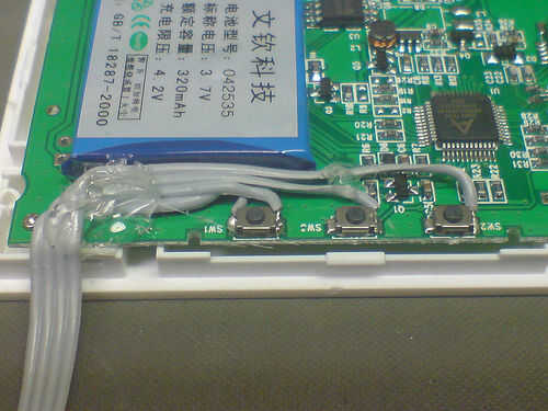 • Soldar un cable del cable de cinta a cada lado del interruptor de encendido/apagado para que cuando se juntan los dos cables del marco de fotos LCD se encenderá.