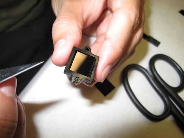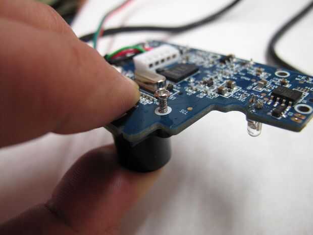 • Con el filtro en su lugar, atornille la nueva montura. Esto requerirá alguna fuerza, y un tornillo pasará en un ángulo porque la nueva montura de la lente es un poco demasiado grande para el tablero.