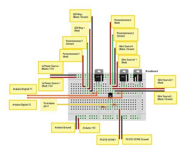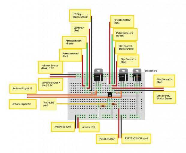 • Después de montar el circuito completo, el código cambiando está listo para la entrada de la cámara en directo. Para cambiar de modo de video demo a modo de cámara en vivo, abrir el "apps/eyewriter-xxxxxxx/eyeWriterTracker/bin/data/Settings/inputSettings.xml" y editar la etiqueta de modo de 1 a 0.