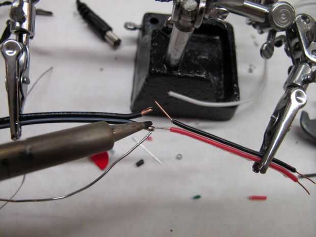 • Usando una tira corta de cables rojo y negro, soldar el cable rojo al cable positivo de adaptadores y suelde el cable negro al cable negativo de adaptadores.
