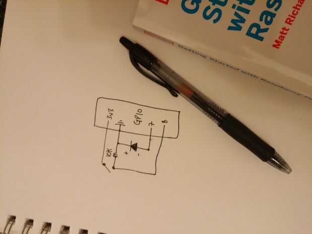 Entonces necesitamos una resistencia de 10K ohm desde el lado del botón pulsador conectado al pin (8), con el conector negativo (tierra) del LED. Un esquema puede verse en las imágenes de arriba. Este es un esquema muy simple y podemos aprender más acerca de lo de la introducción Manual (o ' Reilly) que viene con el kit de Raspberry Pi.