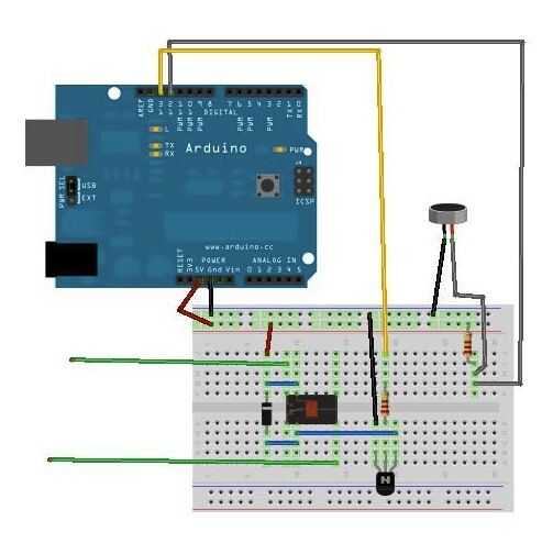 El Arduino cambiará el transistor (utilicé un BC338 que tuve que poner todo, pero probablemente hará cualquier propósito general 5V NPN) y el transistor conmuta el relé. Los alambres verdes desde el relé se conectará a los tornillos en la parte posterior del botón que abre el garaje.