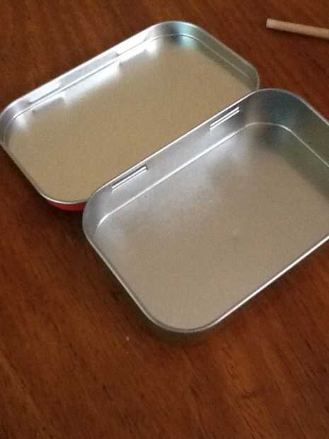 esto hice por aburrimientoPaso 1: agarrar Lo que necesita para obtener 1 Altoid tin 1finger cuchillo alicates/cables cortadores pato de cinta de luz y pequeñas cosas te quieres poner en élPaso 2: Cortar el agujero Su cuchillo y corte el agujero del m