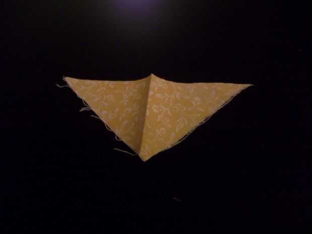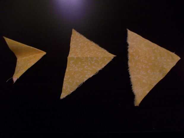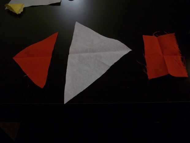 Con una de las telas, cortar dos cuadrados de 6". Se trata de cuerpo de la chica! Con tela de otro color, cortar una de 2" por 3" rectángulo y dóblalo por la mitad ancho - esto es para la corona de la chica. Para el pico, con tela de otro color, corta dos triángulos isósceles ("isósceles" = igual longitud de dos lados, un lado más largo), con los dos lados iguales mide aproximadamente 3" y el lado más largo mide 4 1/2". Para la cola, utilizar tres de las telas: con uno, corte un triángulo isósceles grande, cerca de 8 1/2" largo lateral 6 1/2" los otros dos lados, otro triángulo de 6 1/2" el lado largo y 4 1/2" los lados opuestos, y por último, un triángulo más pequeño de 4 1/2" el lado largo por 3" de los lados opuestos (como los triángulos de pico). Es muy fácil cortar los triángulos si doblar a la tela por la mitad a lo largo, mida desde el centro y luego se corta a partir de ahí!