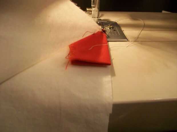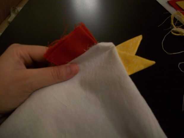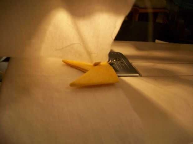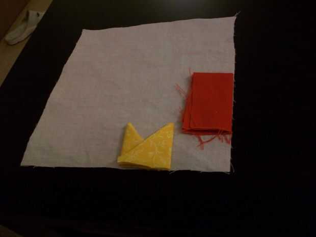 Coloque el pico, mirando hacia el interior, cerca de la esquina de un cuadrado y la corona (también hacia adentro, con la parte doblada en el borde) en la esquina del pico adyacente lateral (véase la foto abajo) Coloque la otra plaza (reverso hacia arriba) sobre esta plaza y coser los bordes con el pico y la corona. Si activa la derecha cuadrada hacia fuera después de coser, se puede ver cómo la chica está empezando a forma!