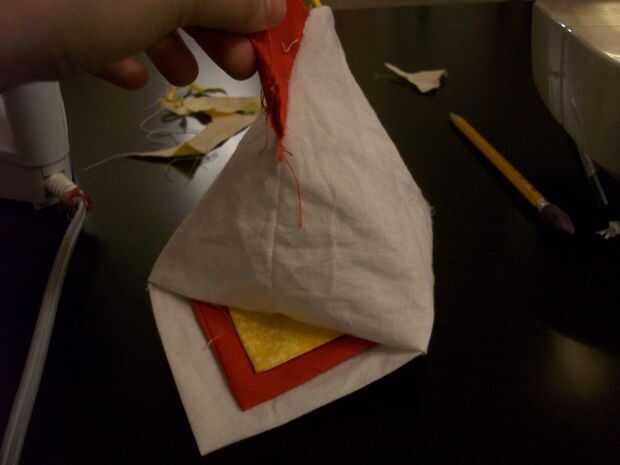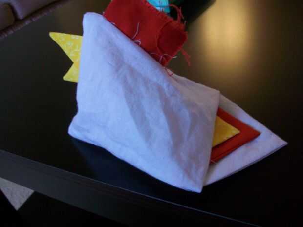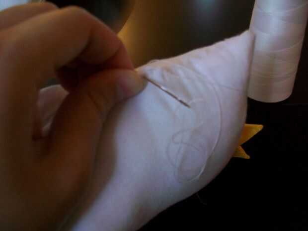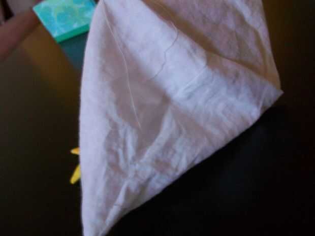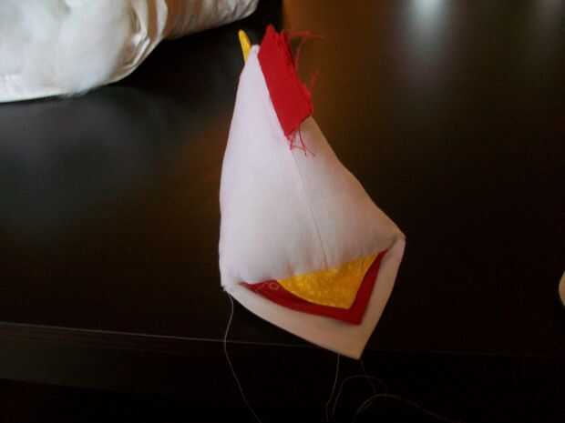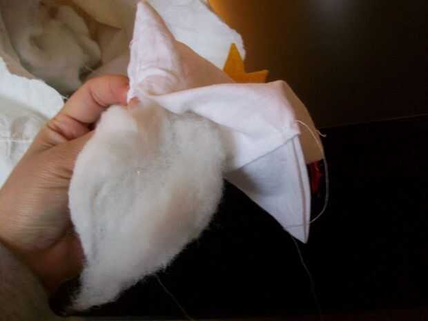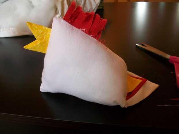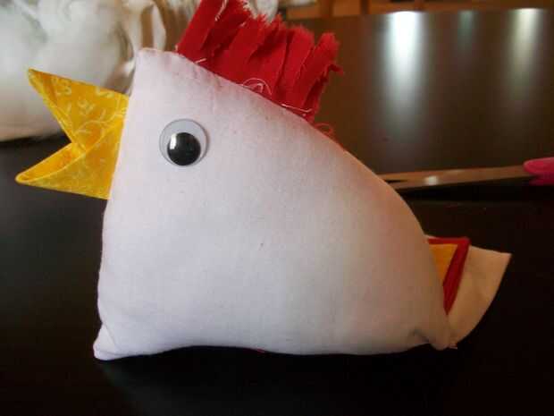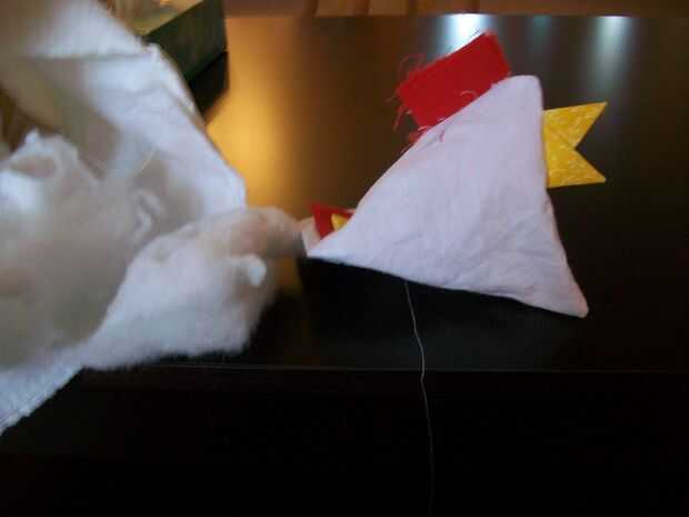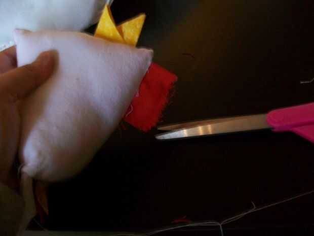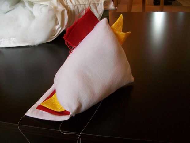 This is the best part! Vuelva el pollo - ¡ se hace! Ahora, sólo cosas con tela de desechos, de bateo, o de la pelusa de una almohada vieja, con la abertura pequeña que quedaba al coser la parte inferior del borde del cuadrado; entonces, mano coser esa abertura. Con la punta de un fuerte par de tijeras, corte la corona permanente en pequeñas tiras. Utilice los botones o los ojos saltones de plástico para los ojos de la chica!
