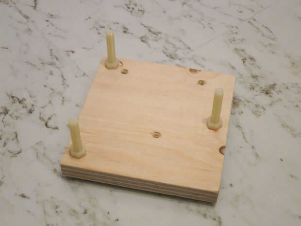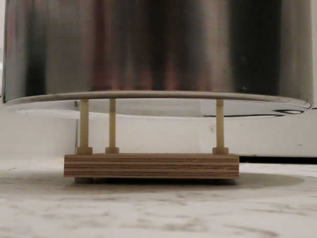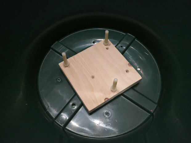 Queremos aislamiento debajo de la olla, así como alrededor de él, por lo que debe ser levantado desde el fondo del recipiente grande. Esto es como lo hice: sólo una pieza de contrachapado con tres tornillos de nylon.