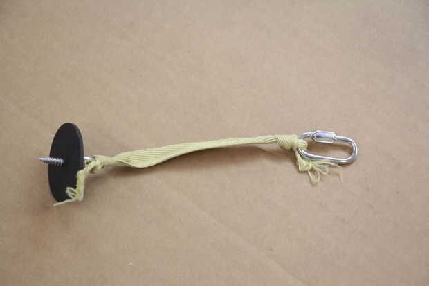 Ahora, tienes que tomar una longitud corta (~ 6-8 ") de espesor blanco cuerda o la correa de kevlar plano mostrado aquí y atar a la gancho de ojo. El otro extremo de la misma debe tener un lazo atado en el mismo, o se ligan a un quick-link como se muestra aquí; usted tendrá que consultar a un procurador acerca de la disponibilidad de enlaces rápidos, sin embargo. El punto de este corte es que el gancho de ojo será más tarde casi inaccesibles y usted puede fácilmente separar el booster a la bahía de carga útil.