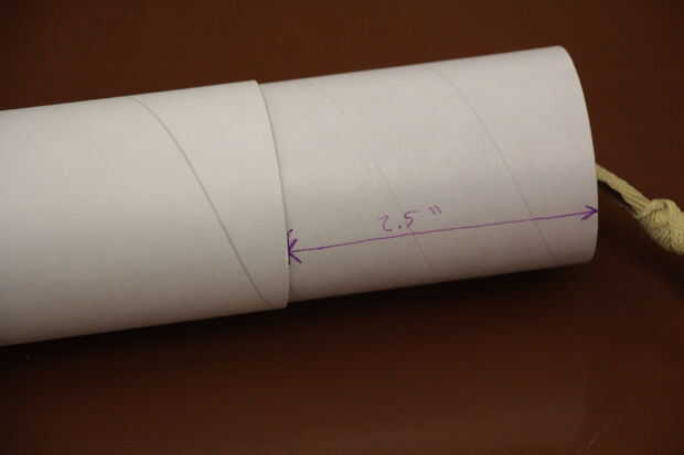 Después de se seque, prueba la forma en la bahía de carga útil. Si no encaja (probablemente porque el tabique no está centrado en el acoplador), arena hasta que lo haga. Mida el 2.5" se muestra en la última imagen, aplique cianocrilato en forma similar al mostrado en el paso 3 en la porción superior del acoplador, y diapositiva-tiempo-torcer el acoplador en la bahía de carga del tubo hasta la línea le dibujó.