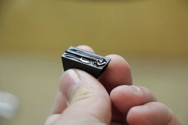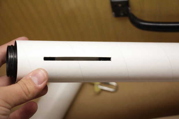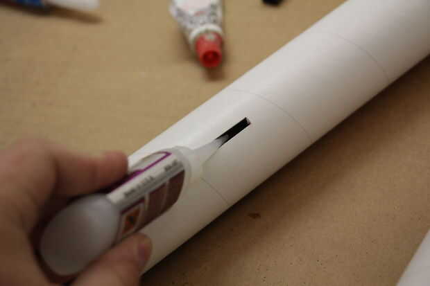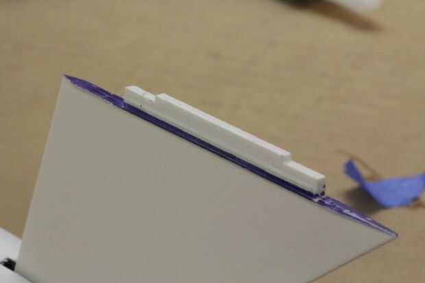 Después de hacer las tres aletas, puede aplicar cianocrilato a las asas de lanzamiento y empuje en sus ranuras. No sientan plana-porque son con fondo plano y los aplica a una célula redonda- pero sólo mantenerlos allí durante unos segundos, hasta que no caigan hacia atrás. Un trozo de cinta azul puede utilizarse también para mantener en su lugar. Las ranuras en la armadura de avión realmente gran trabajo doa asegurándose de que se alineen correctamente, por lo que no tienes que preocuparse por eso.