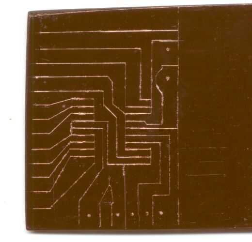 En mi tablero, los electrodos están conectados a lo largo de los bordes izquierdo e inferior. Los arañazos en la pintura deje por debajo del borde. Ellos se corta apartes después de completa el grabado.