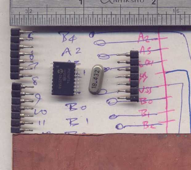 Necesitamos los dos conectores, el PIC, el cristal y algunos condensadores y una resistencia.
