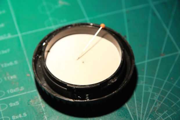 Ahora es el momento para hacer el orificio en la pieza de estaño. Queremos que el agujero perfectamente centrado. Lo hice haciendo un círculo de 24 milímetros. Con un compás y cortar hacia fuera. El agujero dejado por la brújula le guiará hasta el centro de la bodycap. Ahora empuje la aguja a través de.