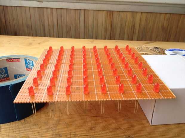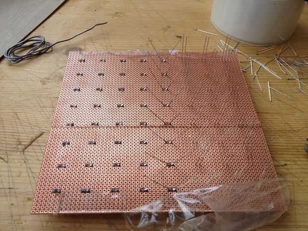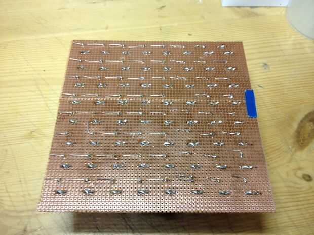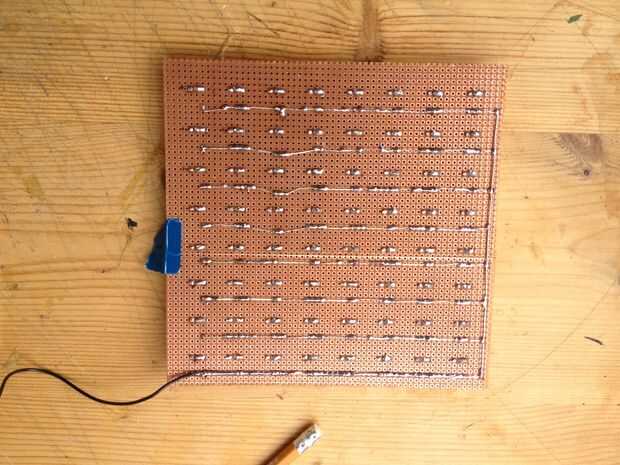 Ahora es hora de conectar todas las 8 filas de parejas de LED-resistor paralelo a una tierra común. Para ello, utilicé un trozo de alambre, soldado perpendicular a las filas previamente soldadas.