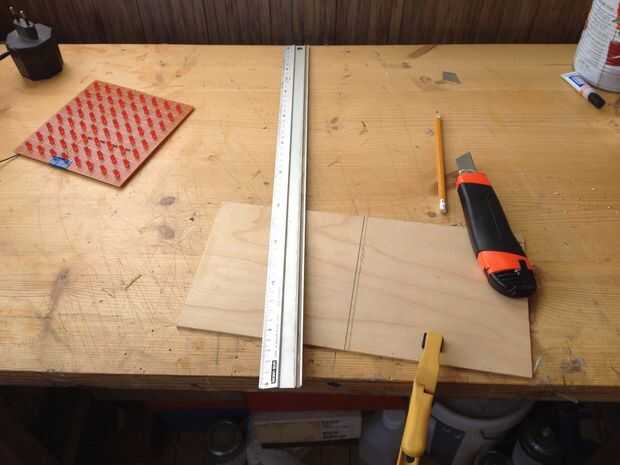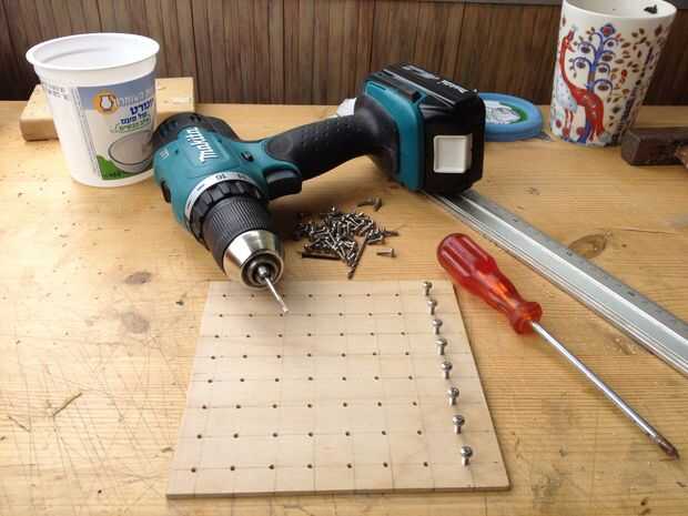 Para perforar los agujeros correctamente, una cuadrícula fue dibujada en la madera contrachapada con un lápiz y una regla. El interlineado debe ser de 1,7 cm.