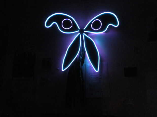Hace un tiempo hice un par de alas de hadas, con el objetivo de fijar EL cable a ellos para hacerlos más impresionante. Usé el tutorial de alas de hadas de threadbanger para esto. Fueron un gran golpe en cada rave fue I. Su éxito me llevó a actualizarlos. Pasó de tener una simple pasada de púrpura alrededor de los bordes púrpura y azul alrededor de los bordes con puntos de ojo morado. Este par se hace siguiendo la ruta más fácil en este instructable.