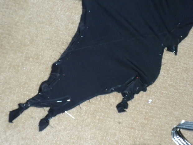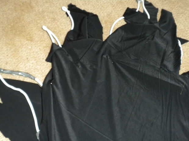 Colocar un recorte en el suelo. Coloque su esqueleto de suspensión sobre eso. Luego coloque otro recorte en la parte superior del esqueleto (sandwich el esqueleto entre dos cortes). Prender las dos piezas de tela juntas fuera del borde del esqueleto. Para asegurarse de que esto se hace uniformemente, yo primero cubrió a todos los lugares que estaban más cercanos a la mitad.