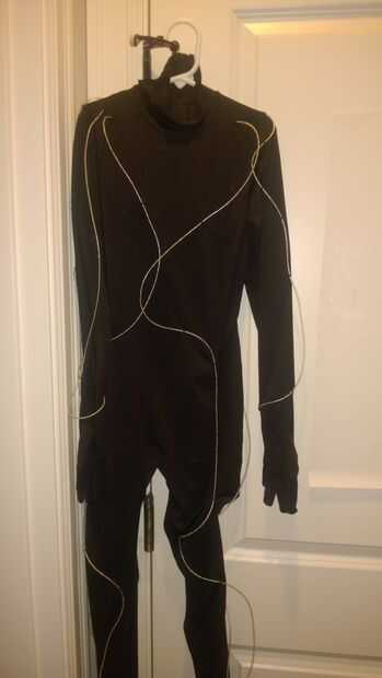Para ver como TRON, necesita medir su frente del hombro al tobillo y su parte posterior y a través de nuevo a su otro lado. Permitir y extras 2 pies por lo que puede tirar el traje y EL alambre sobre su cabeza. Nuestros trajes tomaron cerca de 25 pies de cable.