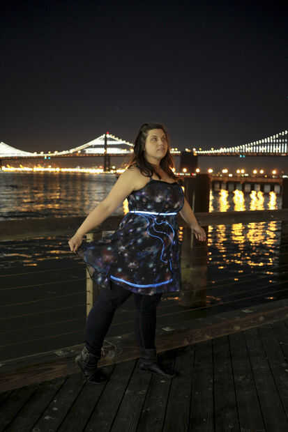 Nicole A. Wolfersberger y yo, con el apoyo del Prof. Kylie Peppler Universidad de Indiana, hizo un vestido de EL-wire controlada por LilyPad Arduino.  Con unos pocos componentes adicionales hemos sido capaces de controlar la frecuencia de parpadeo de